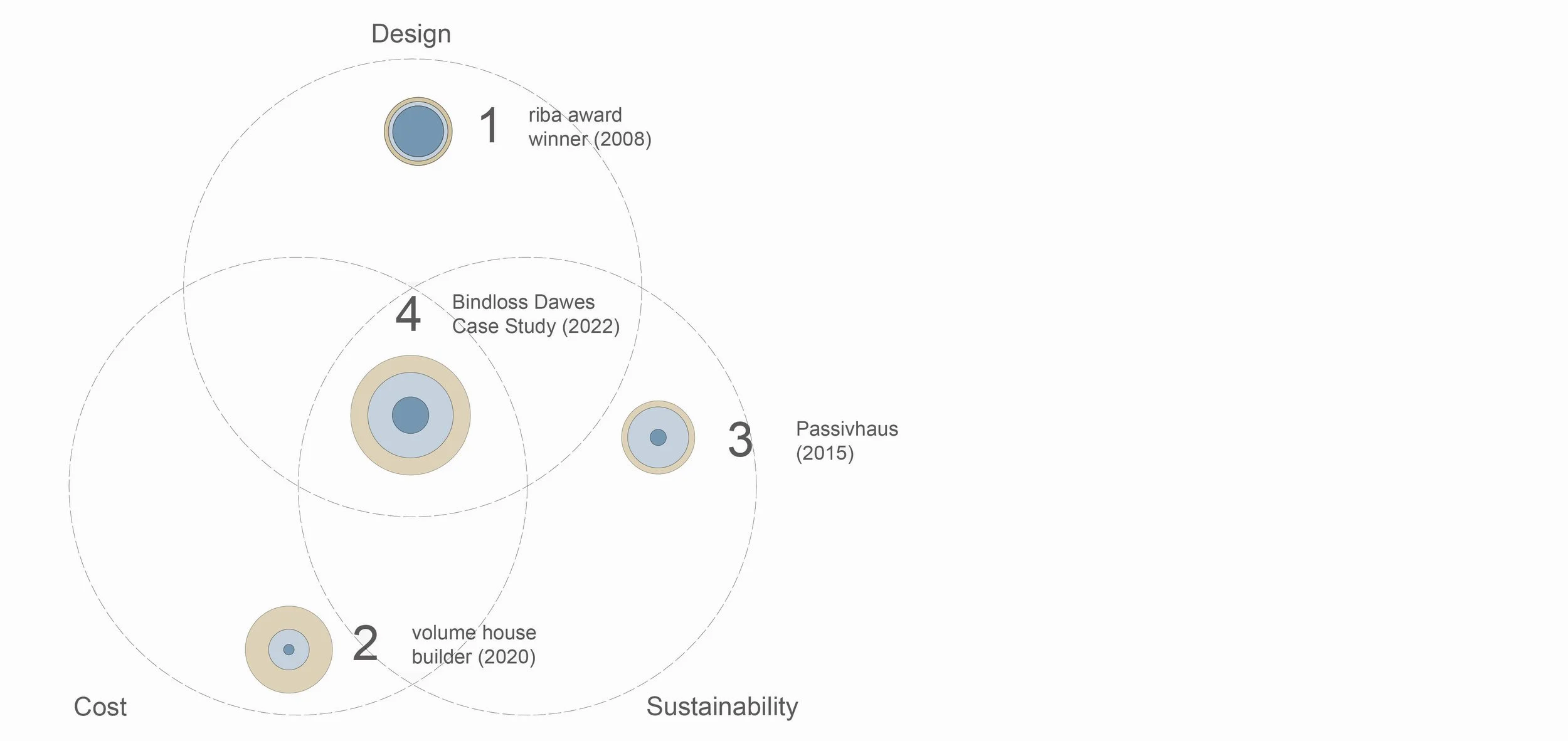 During the design process, together with clients and builders, we are now applying our methodology and assessment criteria to inform our work. Environmental and Cost performance are assessed quantitatively, the former by applying criteria set by Passivhaus, BREEAM, Future Homes Standard, and the UK Green Building Council. Cost and value are assessed using Royal Institute of Chartered Surveyors (RICS) methodology, comparing building components from low-cost contemporary projects, as well as monitoring and comparing our own tender returns.